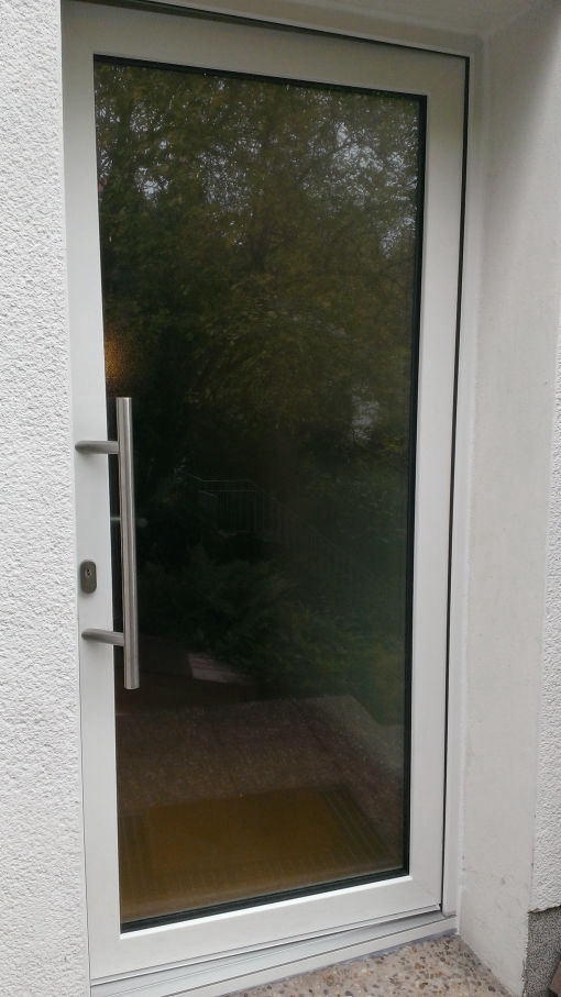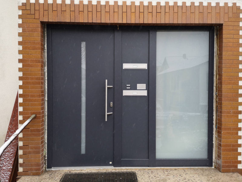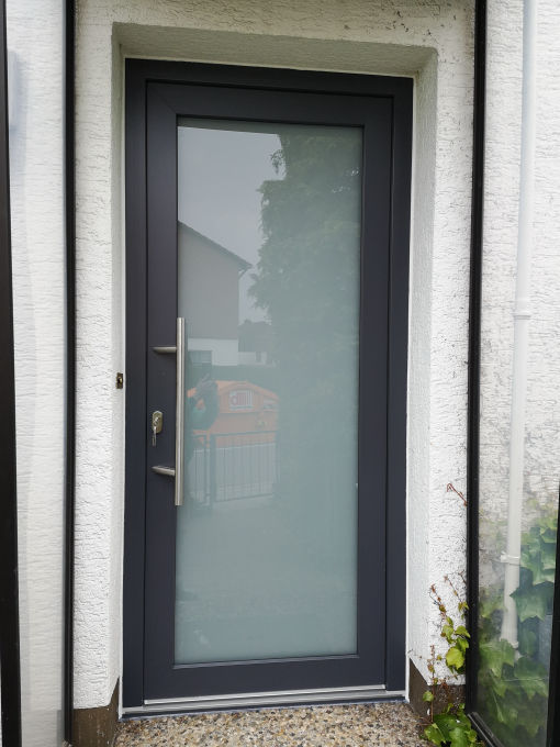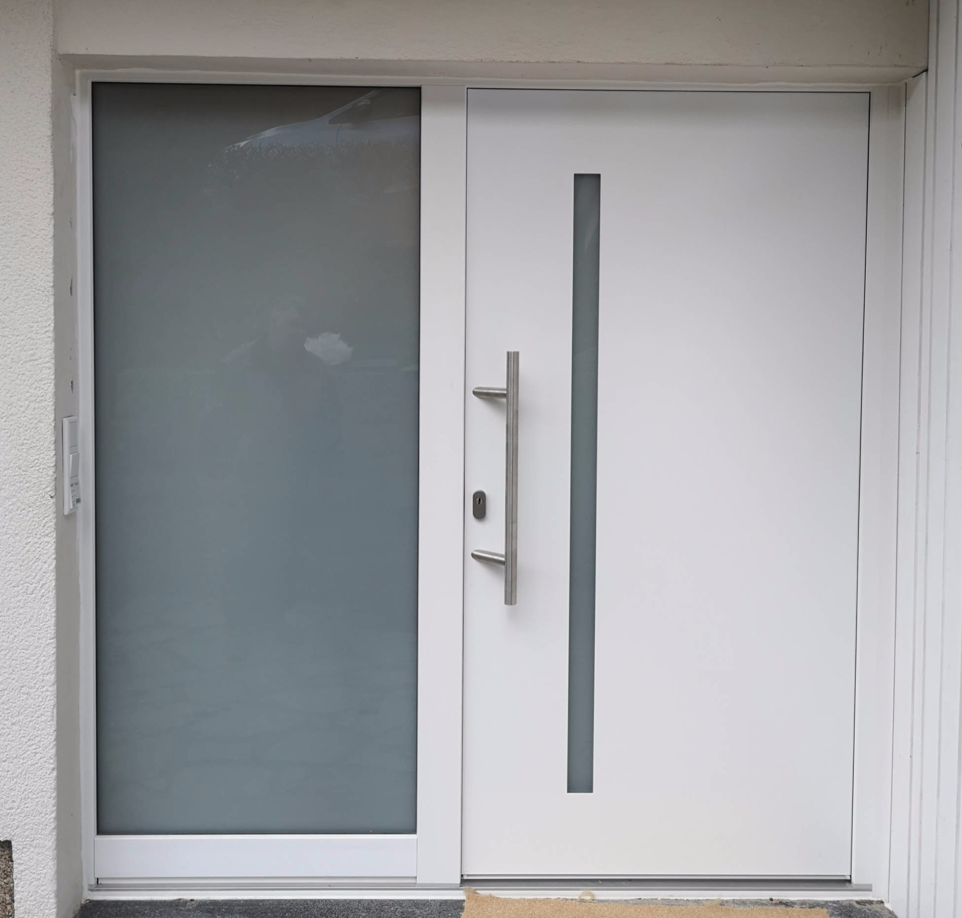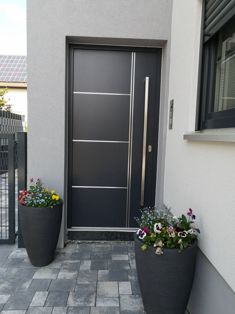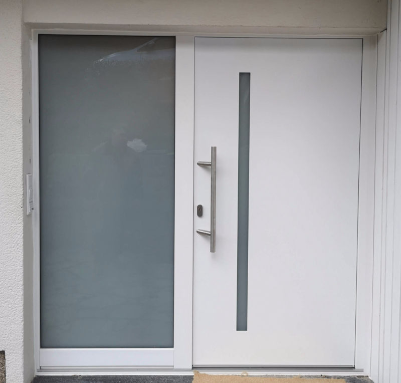 Haustür mit flächenbündiger, flügelüberdeckender Fertigfüllung.