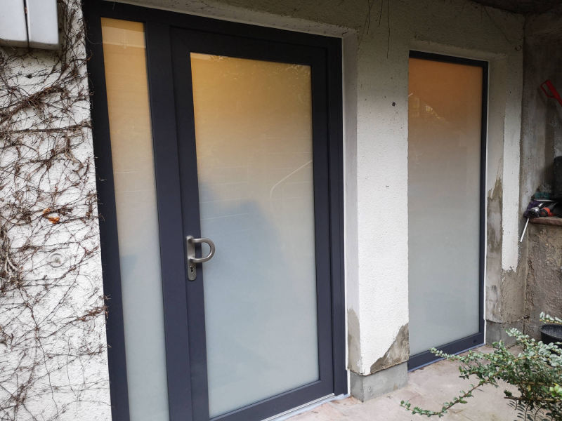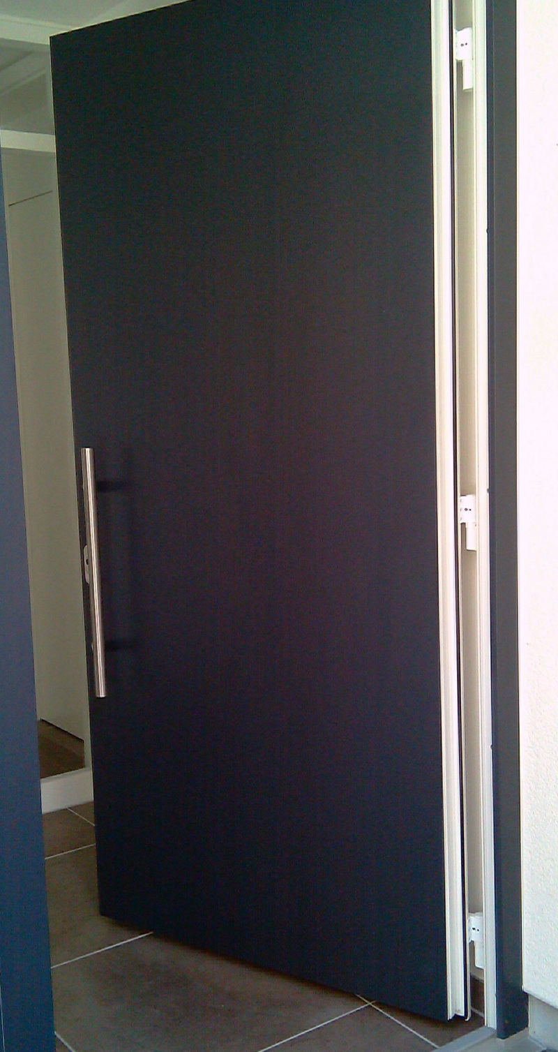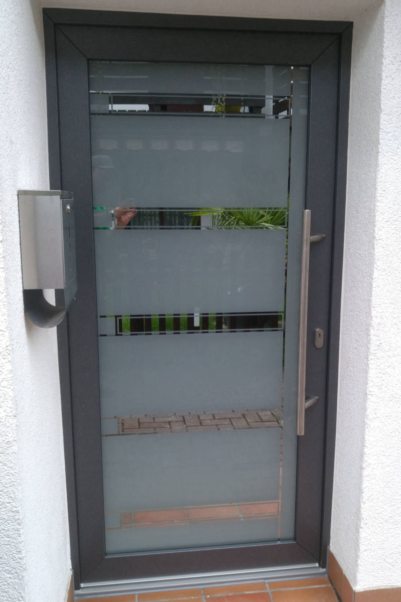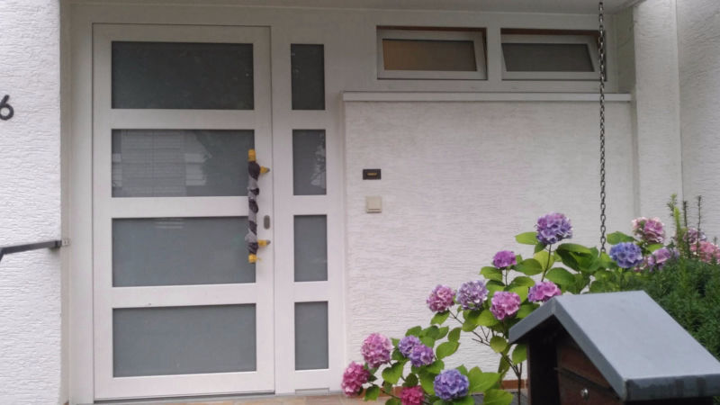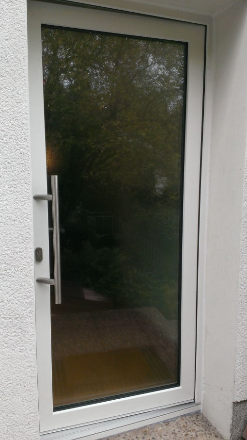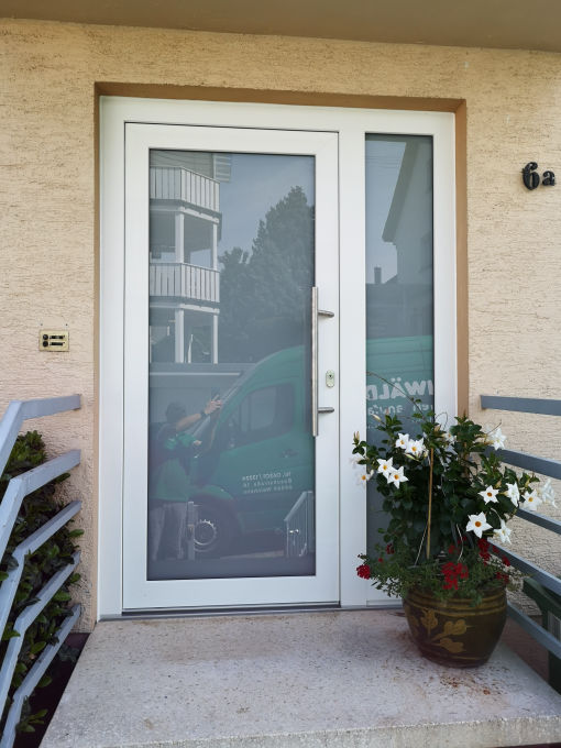 Haustür mit flächenbündiger, flügelüberdeckender Fertigfüllung.